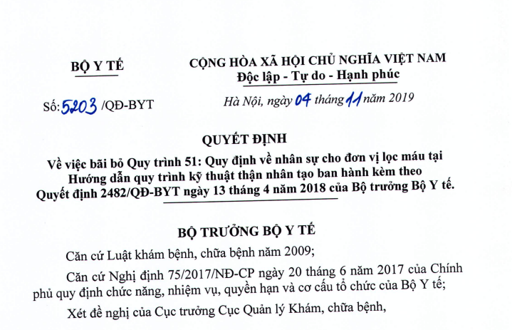VỀ VIỆC BÃI BỎ QUY TRÌNH 51: QUY ĐỊNH VỀ NHÂN SỰ CHO ĐƠN VỊ LỌC MÁU TẠI HƯỚNG DẪN QUY TRÌNH KỸ THUẬT THẬN NHÂN TẠO BAN HÀNH KÈM THEO QUYẾT ĐỊNH 2482/QĐ-BYT NGÀY 13 THÁNG 4 NĂM 2018 CỦA BỘ TRƯỞNG BỘ Y TẾ.