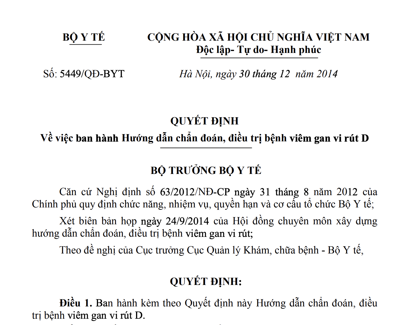 Xét biên bản họp ngày 24/9/2014 của Hội đồng chuyên môn xây dựng hướng dẫn chẩn đoán, điều trị bệnh viêm gan vi rút;