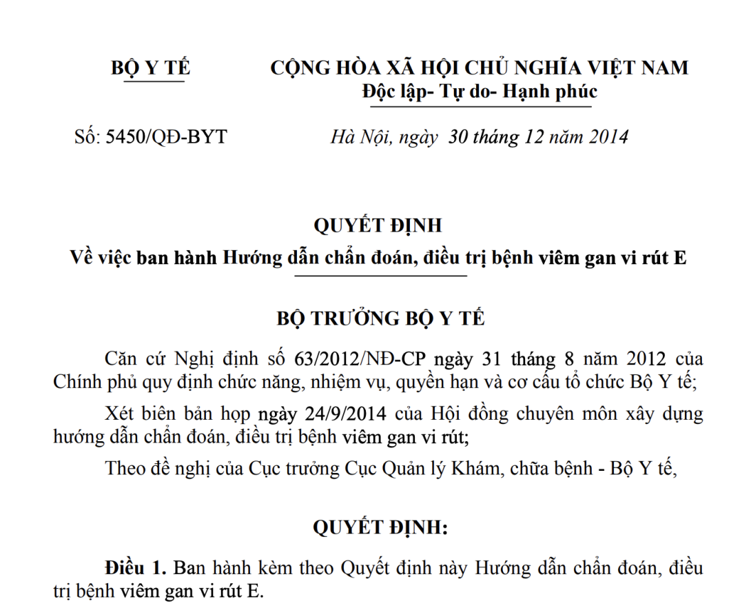 VỀ VIỆC BAN HÀNH HƯỚNG DẪN CHẨN ĐOÁN, ĐIỀU TRỊ BỆNH VIÊM GAN VI RÚT E