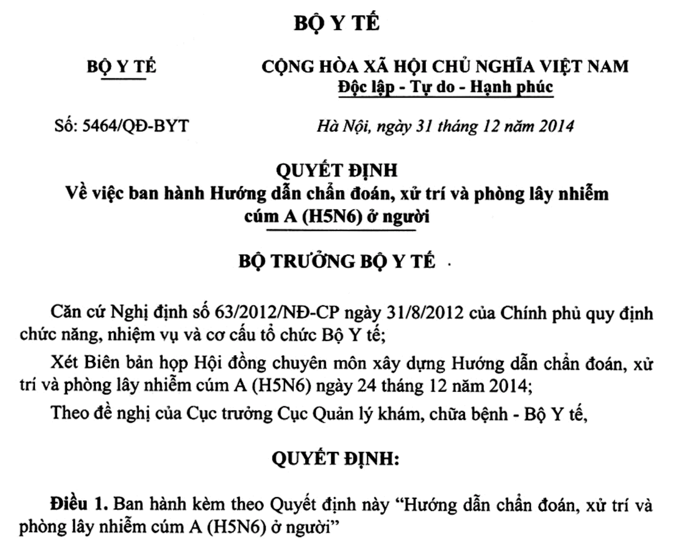 VỀ VIỆC BAN HÀNH HƯỚNG DẪN CHẨN ĐOÁN, XỬ TRÍ VÀ PHÒNG LÂY NHIỄM CÚM A (H5N6) Ở NGƯỜI