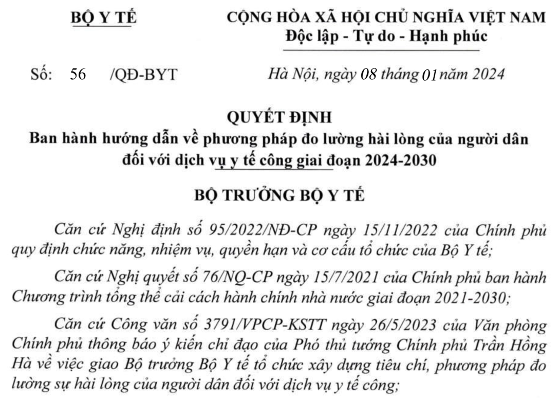 Căn cứ Công văn số 3791/VPCP-KSTT ngày 26/5/2023 của Văn phòng Chính phủ thông báo ý kiến chỉ đạo của Phó thủ tướng Chính phủ Trần Hồng Hà về việc giao Bộ trưởng Bộ Y tế tổ chức xây dựng tiêu chí, phương pháp đo lường sự hài lòng của người dân đối với dịch vụ y tế công;