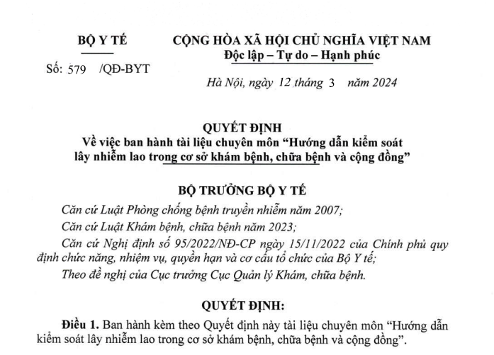 VỀ VIỆC BAN HÀNH TÀI LIỆU CHUYÊN MÔN “HƯỚNG DẪN KIỂM SOÁT LÂY NHIỄM LAO TRONG CƠ SỞ KHÁM BỆNH, CHỮA BỆNH VÀ CỘNG ĐỒNG”