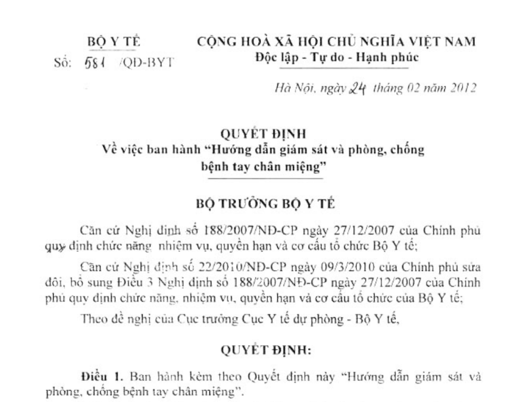 Quyết định 581/QĐ-BYT ngày 24/02/2012 "Hướng dẫn giám sát và phòng, chống bệnh tay chân miệng" do Bộ trưởng Bộ Y tế ban hành