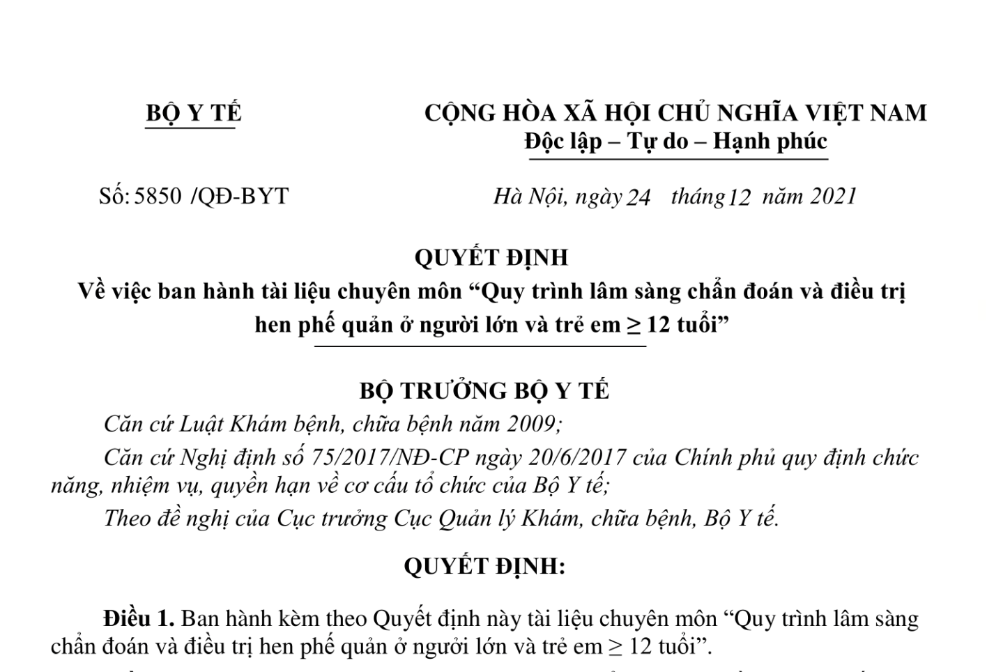 Điều 1. Ban hành kèm theo Quyết định này tài liệu chuyên môn “Quy trình lâm sàng chẩn đoán và điều trị hen phế quản ở người lớn và trẻ em ≥ 12 tuổi”.