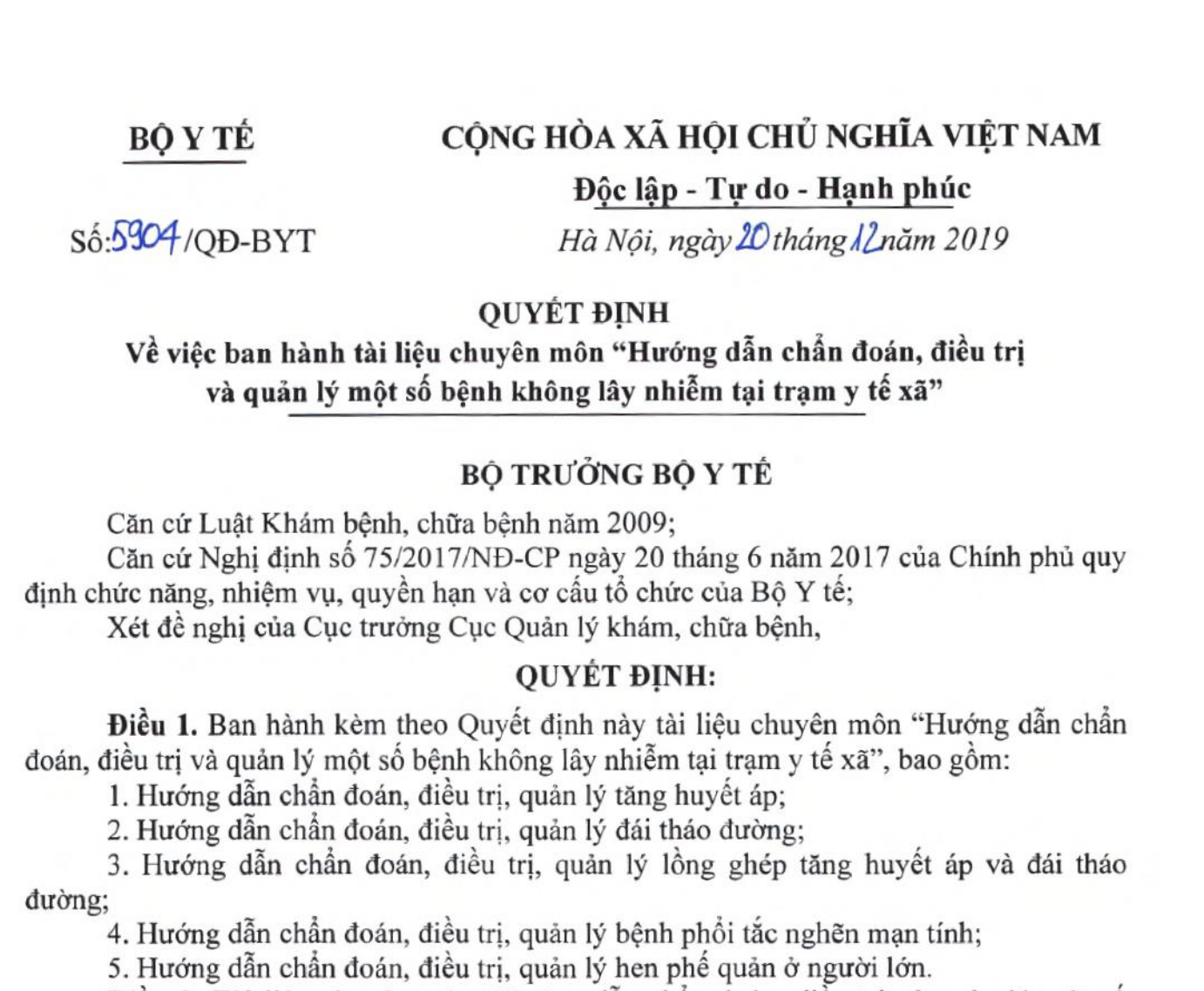 Điều 1. Ban hành kèm theo Quyết định này tài liệu chuyên môn “Hướng dẫn chẩn đoán, điều trị và quản lý một số bệnh không lây nhiễm tại trạm y tế xã”, bao gồm: