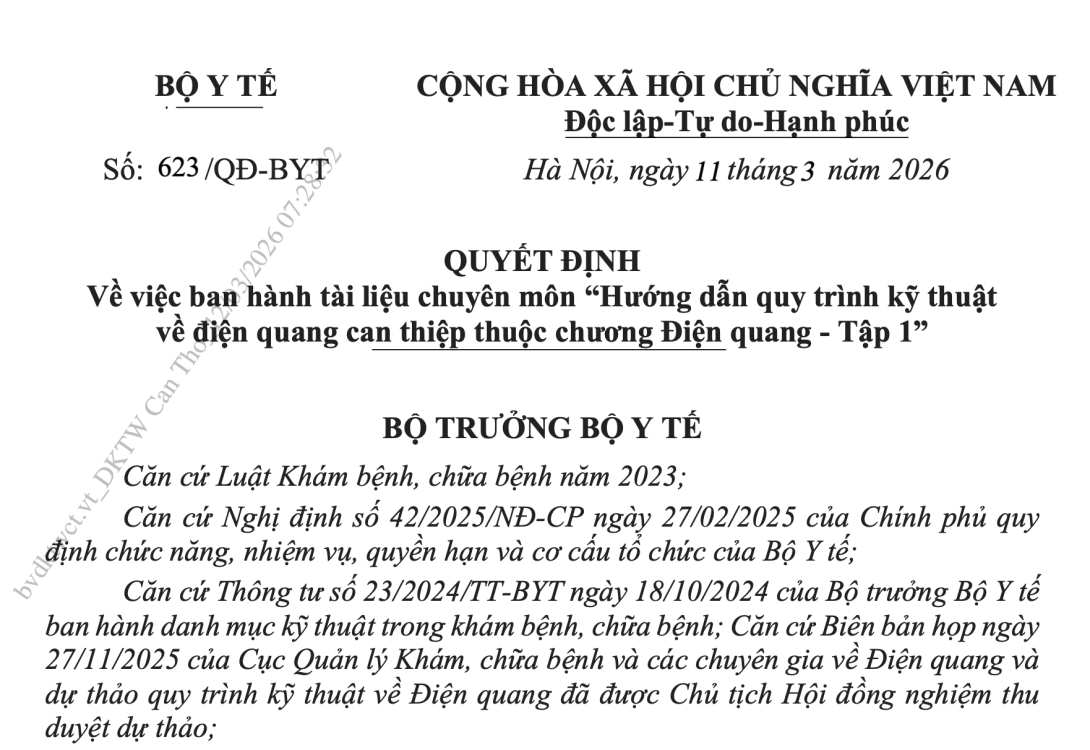 Căn cứ Thông tư số 23/2024/TT-BYT ngày 18/10/2024 của Bộ trưởng Bộ Y tế ban hành danh mục kỹ thuật trong khám bệnh, chữa bệnh; Căn cứ Biên bản họp ngày 27/11/2025 của Cục Quản lý Khám, chữa bệnh và các chuyên gia về Điện quang và dự thảo quy trình kỹ thuật về Điện quang đã được Chủ tịch Hội đồng nghiệm thu duyệt dự thảo;