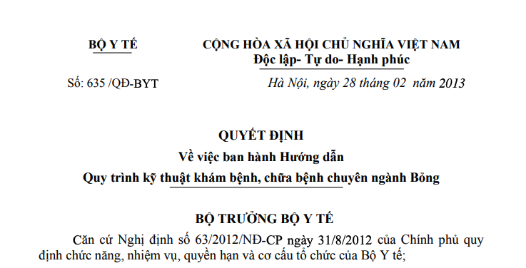 Quyết định 635/QĐ-BYT năm 2013 hướng dẫn Quy trình kỹ thuật khám, chữa bệnh chuyên ngành Bỏng do Bộ trưởng Bộ Y tế ban hành