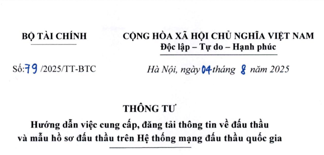 Thông tư 79/2025/TT-BTC hướng dẫn việc cung cấp, đăng tải thông tin về đấu thầu và mẫu hồ sơ đấu thầu trên Hệ thống mạng đấu thầu quốc gia do Bộ trưởng Bộ Tài chính ban hành
