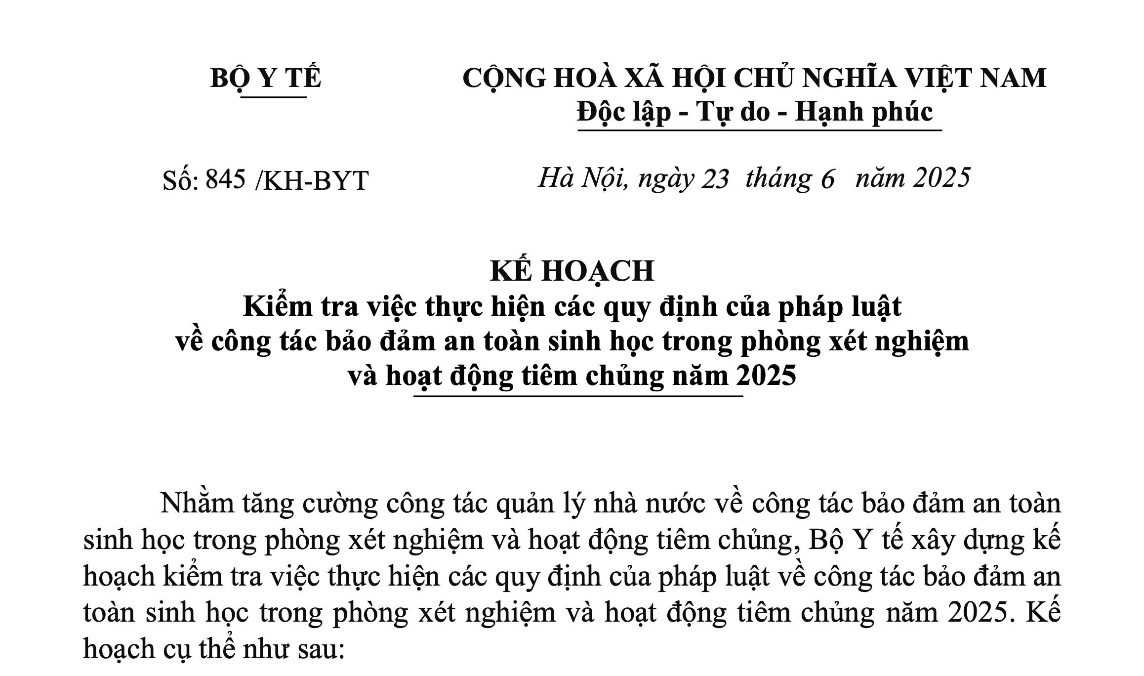 Ngày 23/6/2025, Bộ Y tế ban hành Kế hoạch kiểm tra việc thực hiện các quy định pháp luật về an toàn sinh học trong phòng xét nghiệm và hoạt động tiêm chủng năm 2025. Kế hoạch nhằm tăng cường hiệu quả quản lý nhà nước, kịp thời chấn chỉnh sai phạm, đồng thời ghi nhận vướng mắc thực tiễn để kiến nghị hoàn thiện pháp luật.