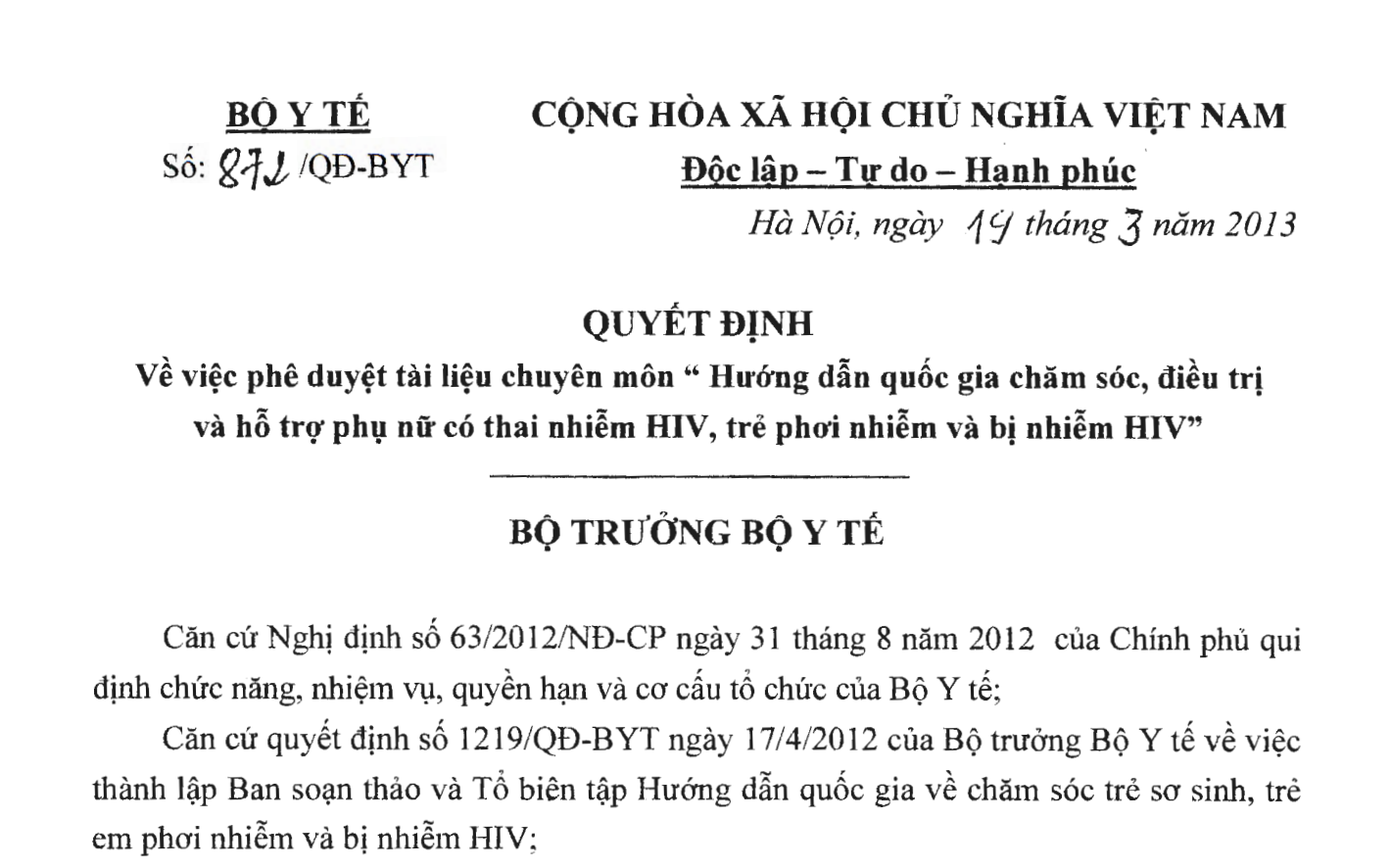 Quyết định 872/QĐ-BYT ngày 19/03/2013 phê duyệt tài liệu chuyên môn "Hướng dẫn quốc gia chăm sóc, điều trị và hỗ trợ phụ nữ có thai nhiễm HIV, trẻ phơi nhiễm và bị nhiễm HIV" do Bộ trưởng Bộ Y tế ban hành