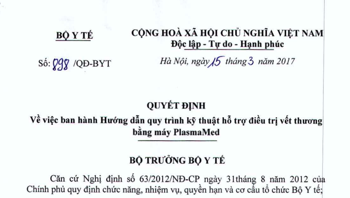 VỀ VIỆC BAN HÀNH HƯỚNG DẪN QUY TRÌNH KỸ THUẬT HỖ TRỢ ĐIỀU TRỊ VẾT THƯƠNG BẰNG MÁY PLASMAMED